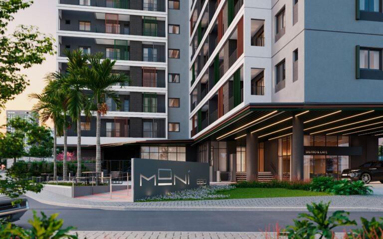 Entre as soluções de “fruição pública” do Moní estão o acesso principal ao empreendimento na esquina, valorizando a vista do edifício e a integração urbana; a conversão do espaço de estacionamento em praça aberta ao público, incentivando a integração urbana; substituição do jardim frontal por um boulevard público com espaço para permanência; bicicletário para incentivar a mobilidade sustentável para o público externo e interno; áreas verdes que mitigam o desconforto acústico; rua compartilhada, que permite o uso pelo pedestre; mobiliário urbano de acordo com as diretrizes do IPPUC, que estimula a permanência no local.